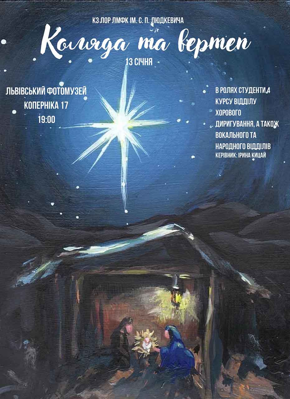 Студенти 4-го курсу відділів хорового диригування, а також вокального та народного відділів підготували особливу програму. Це не просто виступ, а живе відтворення давніх традицій у форматі класичного вертепу та багатоголосних колядок. Орієнтовний початок о 19.00, керівник Ірина Кицай.